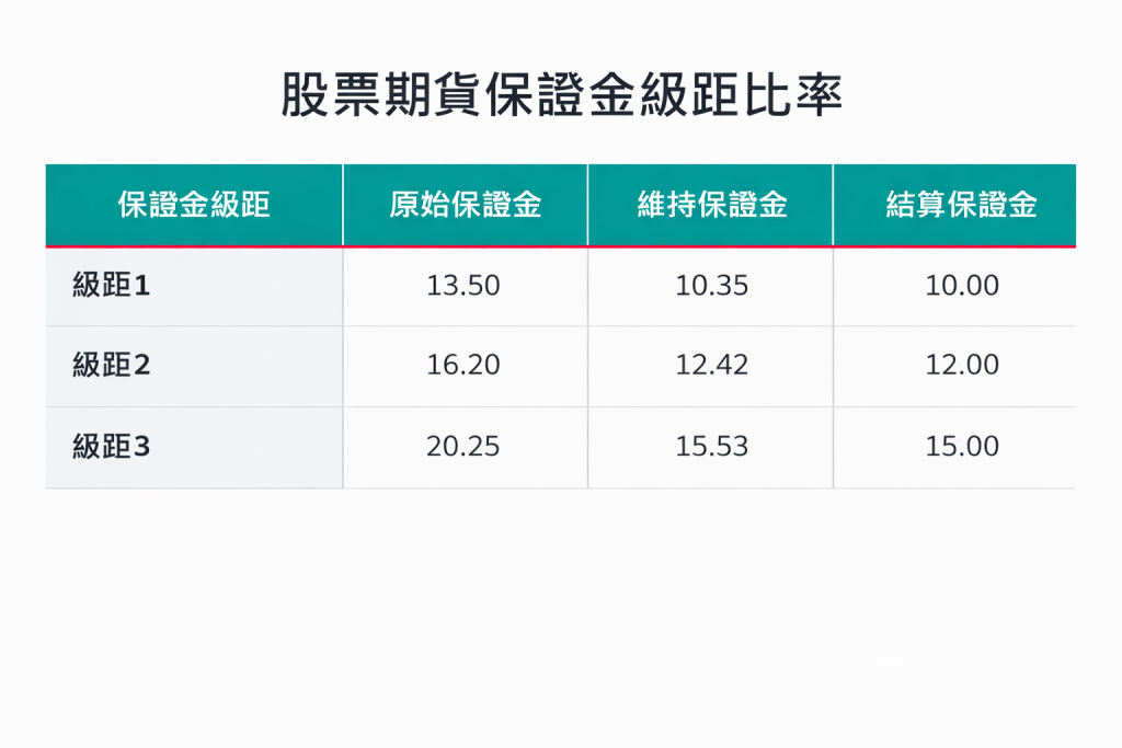 目前股期的保證金比例大致可分為 三種級距,而市場上多數股期標的皆屬於級距一。投資人可透過台灣期貨交易所查詢各檔股期的最新保證金級距與金額,並須留意相關規定可能會隨市場行情變動而調整。